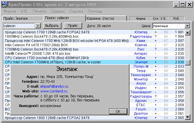 Архив прайс-листов (и программу) можно получить электронной почтой.